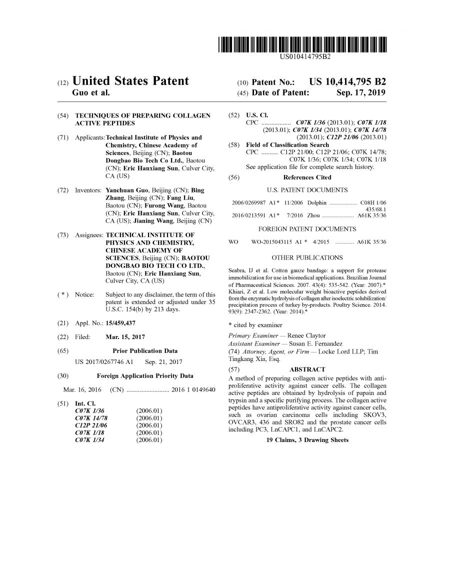 专利名称:《TECHNIQUES OF PREPARING COLLAGEN ACTIVE PEPTIDES》(胶原卵白活性肽制备手艺)